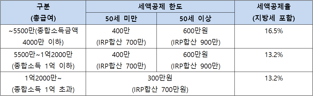 위 표에서 퇴직연금(IRP) 합산 내용이 있어서 다소 혼동이 될 수 있는데 연금저축계좌에 대한 세액공제 한도는 퇴직연금(IRP)계좌 세액공제와 한도가 공유됩니다. 그리하여 연금저축계좌 세액공제만 받을 경우 한도가 300만원~600만원이며 퇴직연금계좌까지 합산하면 700만원~900만원의 한도로 세액공제가 가능한 것입니다.